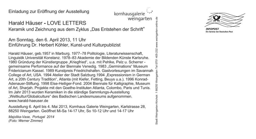 Der Titel Love Letters ist auch als Hommage an den Schöpfungsprozeß an sich zu verstehen. Die Abstrahierung bei der Entstehung von Schrift vom dargestellten Objekt/Figur aus, über das vereinfachende Symbol, zum reinen Zeichen ist in allen Kulturkreisen auch ein Weg zu einer komplexeren Kommunikation. Diesen Prozess, der sich auch während dem Entstehen innerhalb der jeweiligen Werke vollzieht, begreifbar zu machen, ist das Anliegen. Die Keramiken entstanden in der Majolika-